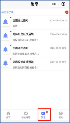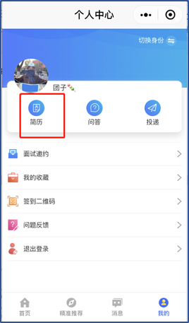 (4)【消息】中查看面试邀约通知,个人中心里【面试邀约】查看自己的面试,以及在【简历】编辑完善简历。