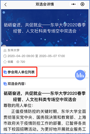 (3)【双选会】中搜索东华大学或武汉纺织大学,查看双选会-点击参会用人单位列表,查看单位与职位,进行投递简历,等待面试通知。