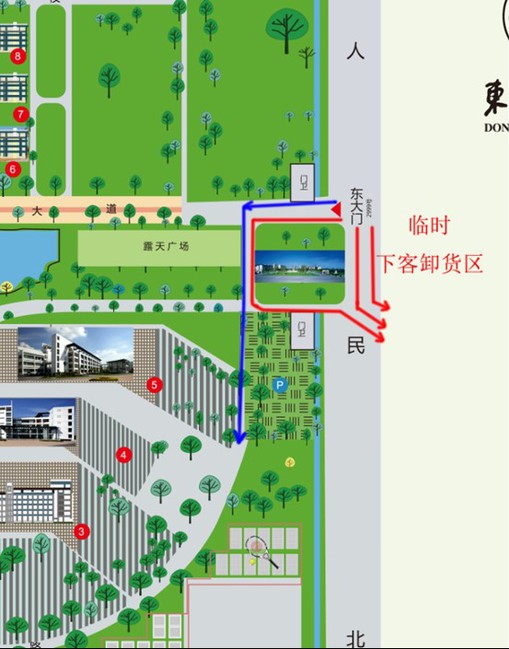 3、对于送新生自驾车,分别设置广富林路门入校缓冲区(见图1)和人民北路门入校缓冲区(见图2)。9月10日-11日禁止校内车辆停放在缓冲区道路上。请全校师生非必要不在缓冲区道路活动。