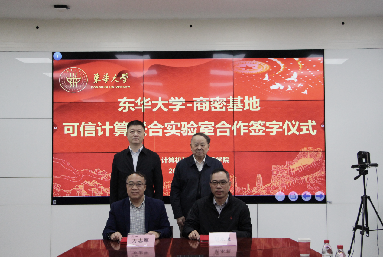 计算机学院院长方志军和商用密码产业基地总经理胡永表代表双方签署了《东华大学-商密基地可信计算联合实验室合作协议》,陈革副校长与沈昌祥院士共同见证。