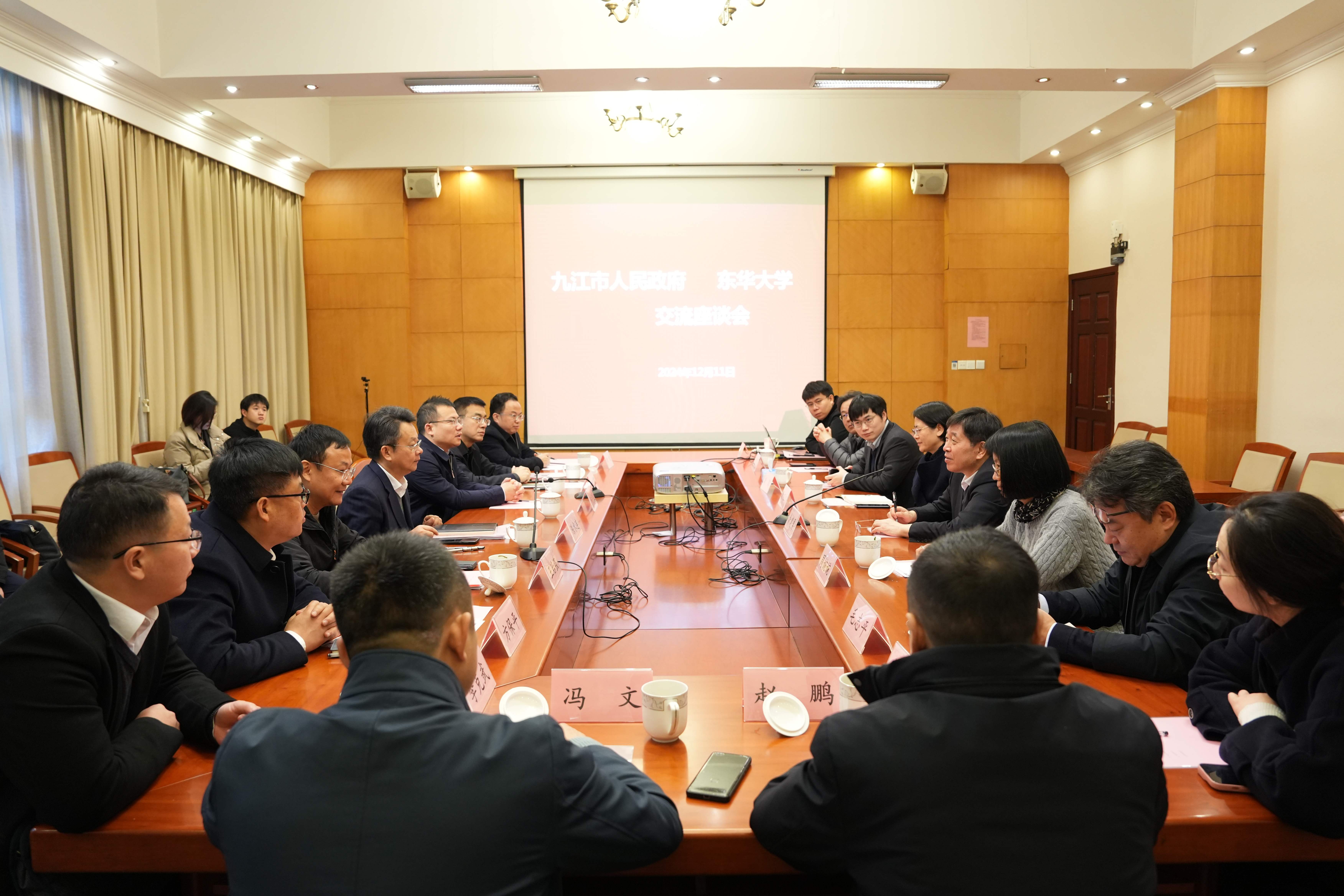 九江市濂溪区、驻沪办、商务局、工信局、贸促会、德安县、共青城高新区等相关负责人,以及我校校长办公室、科学技术研究院、化学与化工学院、纺织科创中心、纺织学院等相关负责人和老师参加调研座谈,并就双方交流合作深入探讨。