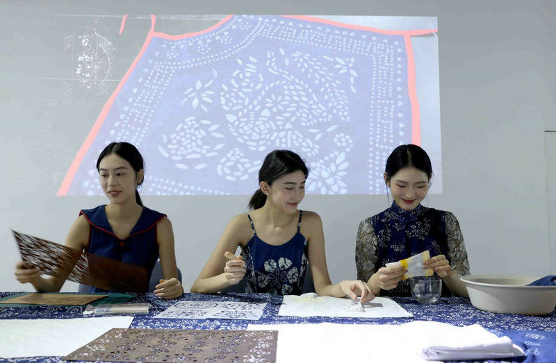 12月13日,模特在展览互动区体验制作蓝印花布的乐趣。