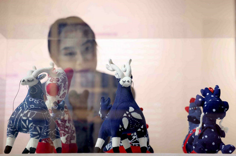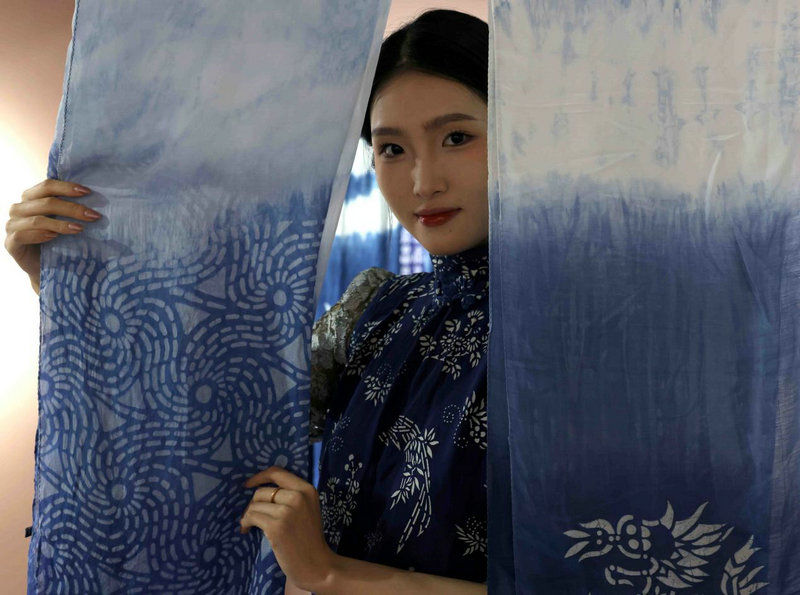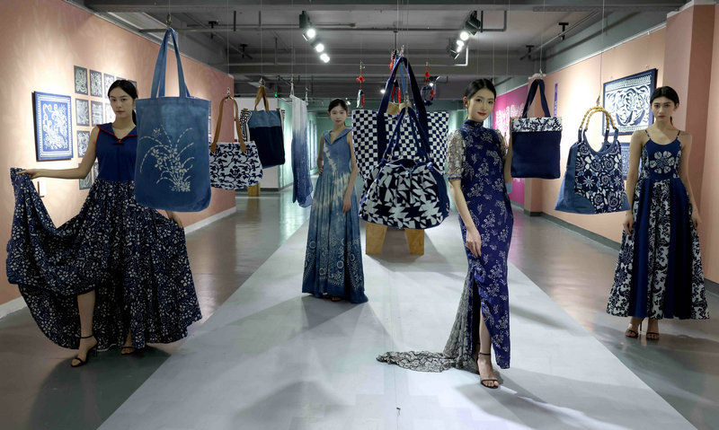 12月13日,模特在展示蓝印花布工艺品。