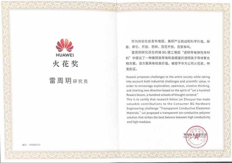 近期,雷周玥研究员在终端 BG 硬工难题“透明导电弹性体材料”中提出了一种兼顾高导电和高模量的透明离子导体聚合物方案。该方案具有较高应用价值,被华为公司授予火花奖,也是我校教师第一次获得该奖项。