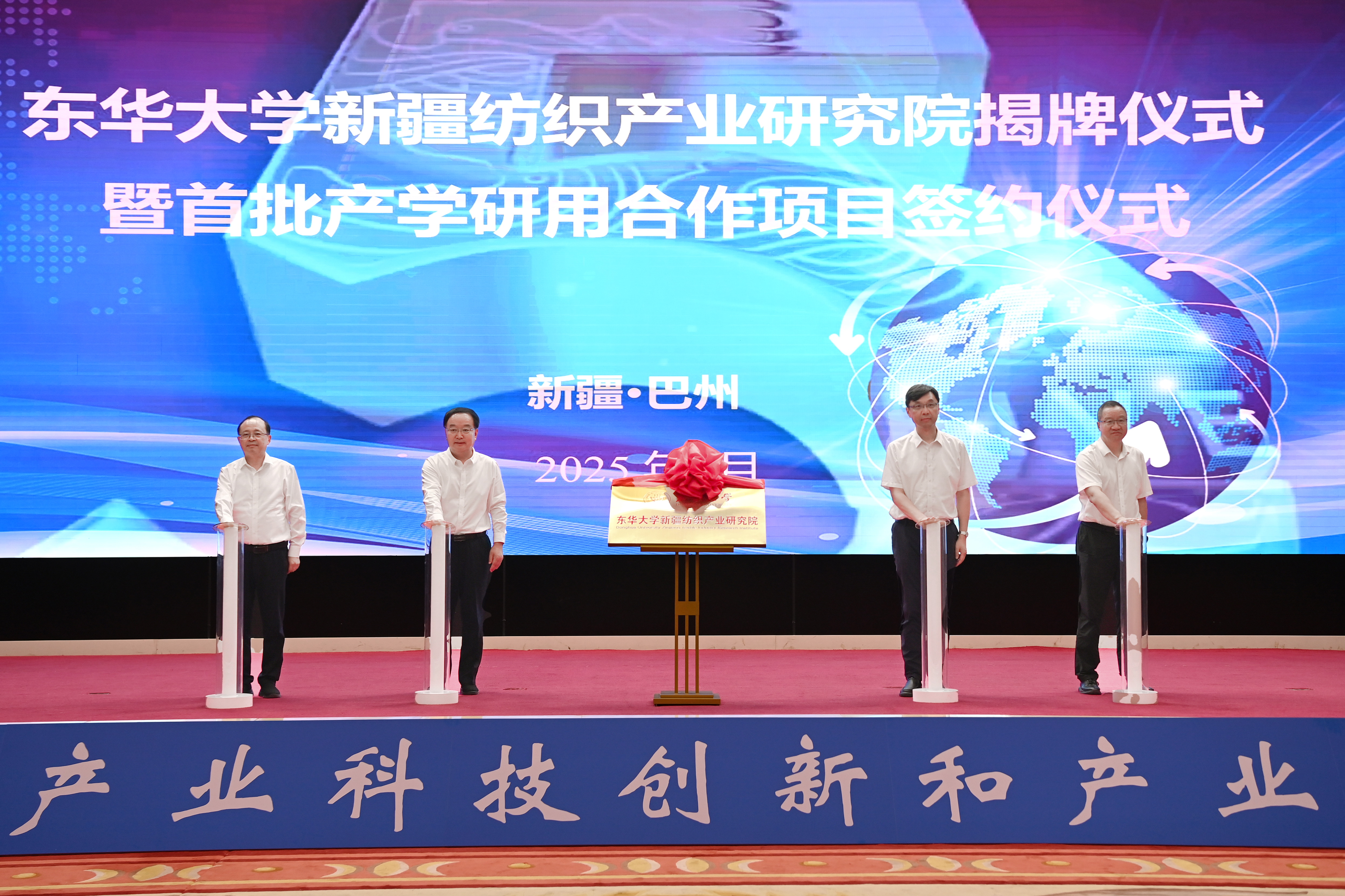 适逢第十次全国对口支援新疆工作会议召开之际,7月10日,东华大学新疆纺织产业研究院揭牌仪式暨首批产学研用合作项目签约仪式在新疆巴音郭楞州库尔勒市举行。新疆自治区棉花产业发展领导小组办公室主任梁勇、校党委书记刘承功与巴州党委书记任广鹏共同为研究院揭牌,研究院理事长、我校副校长陆卫兵宣读院长任命书并为理事单位颁发牌匾。