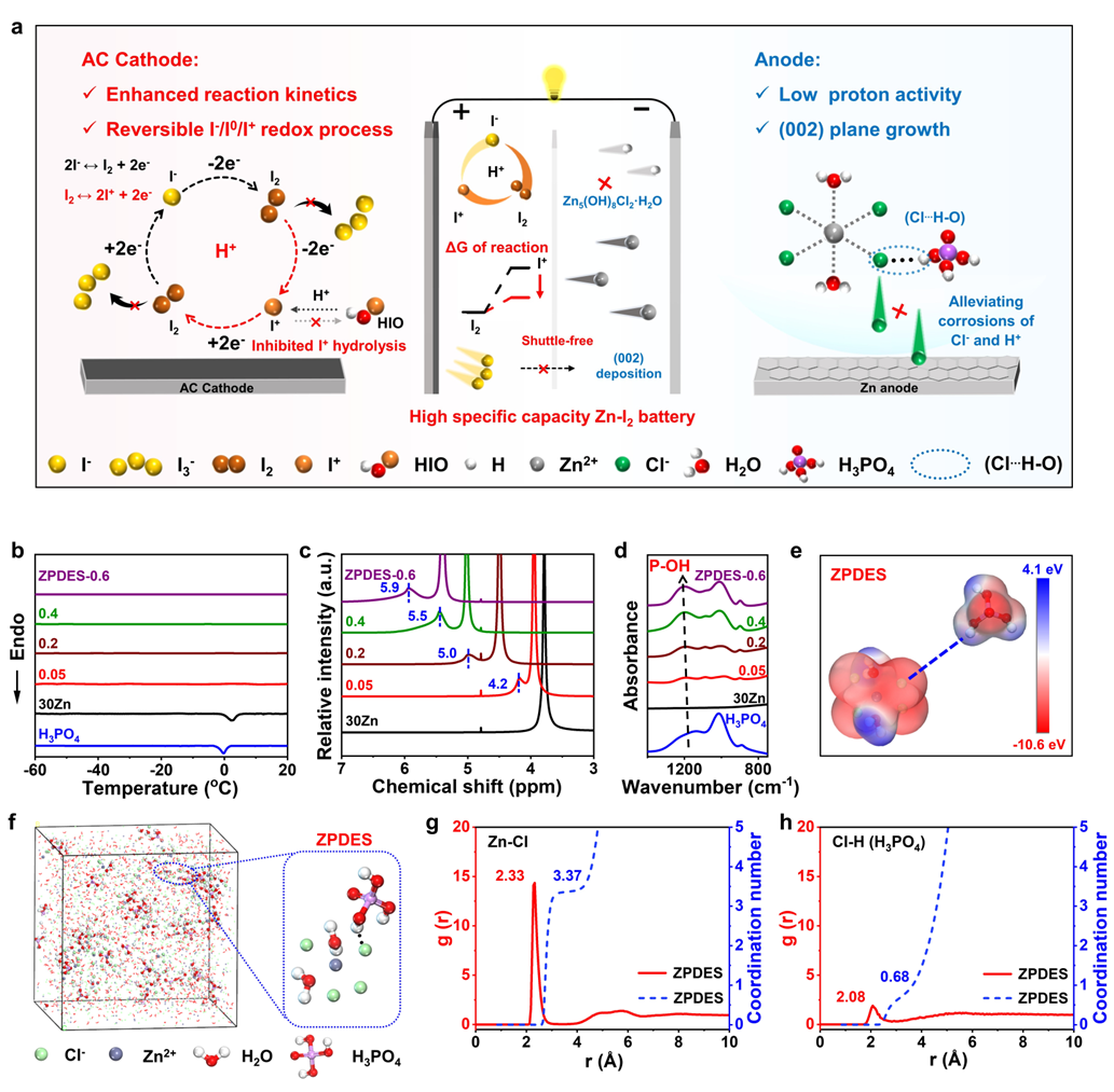 近期,东华大学化学与化工学院武培怡/焦玉聪团队提出了基于酸性深共晶电解质(ZPDES)的电解液调控新策略。研究中通过混合高浓度氯化锌和磷酸形成深共晶电解质(图1)。