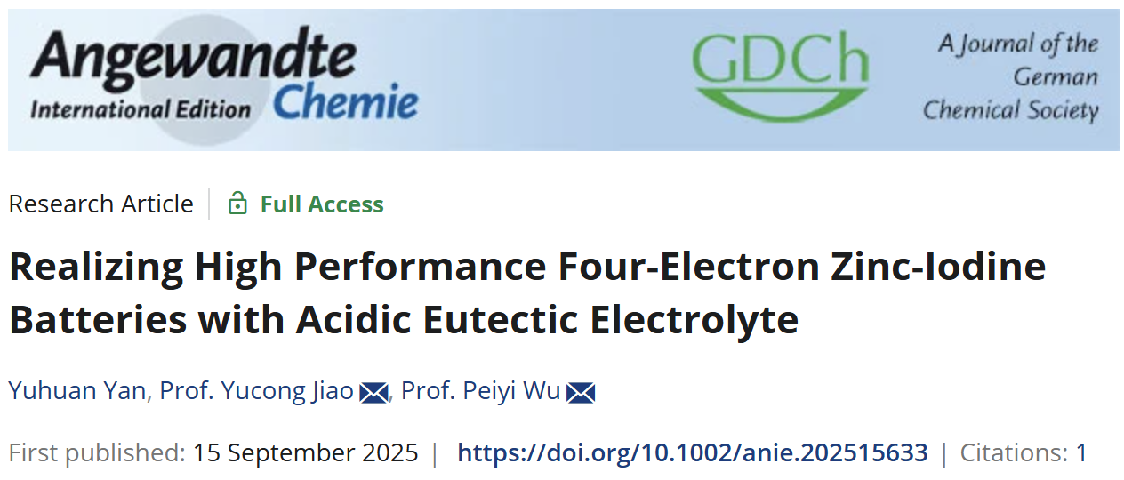 东华大学化学与化工学院硕士生阎语欢为本论文的第一作者,通讯作者为焦玉聪研究员和武培怡教授。相关成果近期以“酸性深共晶电解质实现高性能四电子锌碘电池(Realizing High-Performance Four-Electron Zinc–Iodine Batteries with Acidic Eutectic Electrolyte)”为题发表在《德国应化》(Angew.Chem.Int.Ed.)上。该工作得到了国家自然科学基金、中央高校基本科研业务费专项资金以及上海市自然科学基金的等资助。