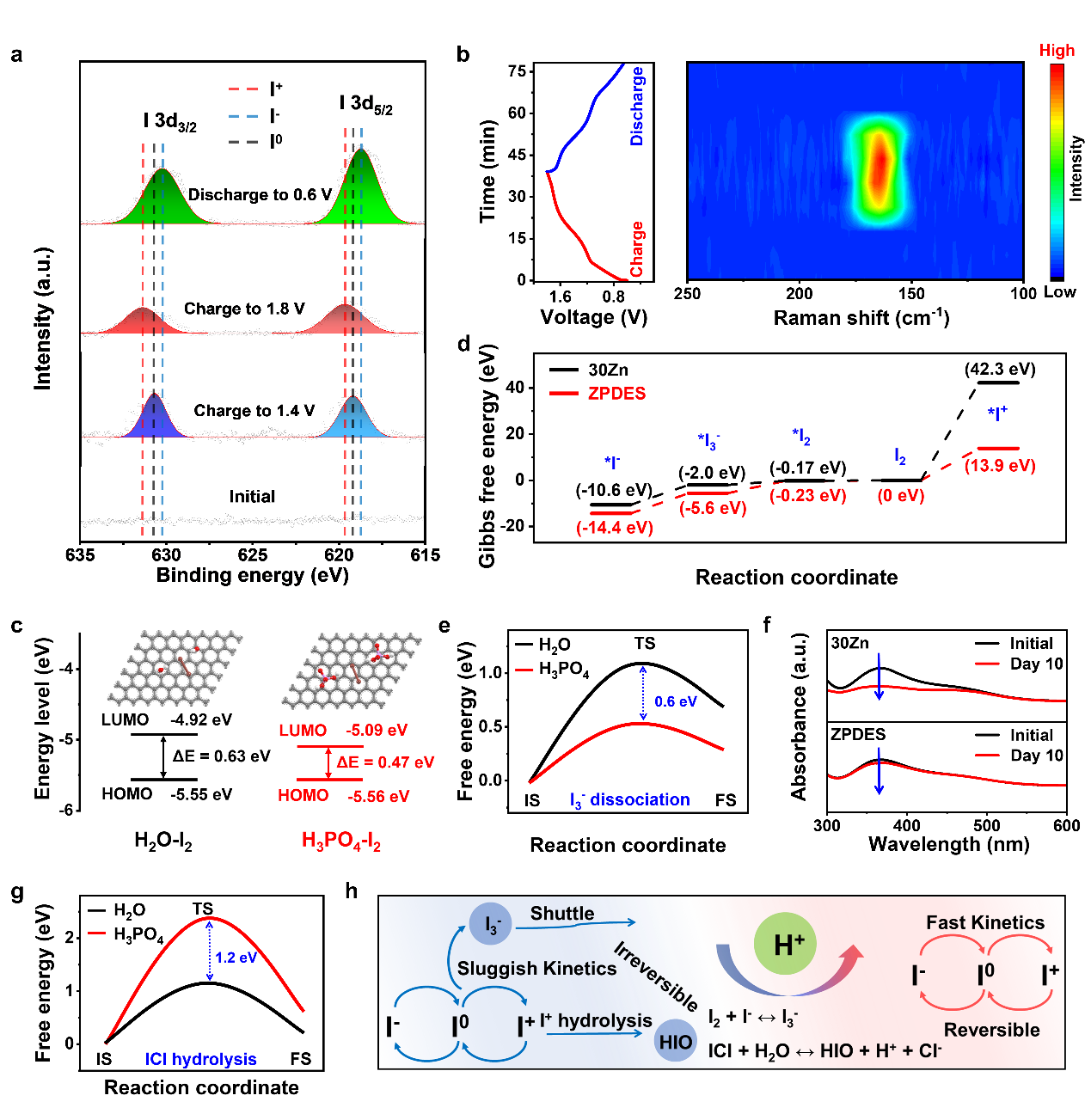 ZPDES体系中实现了可逆的四电子反应。该体系能够加速I2的氧化还原动力学,显著降低I0/I+转化能垒,同时抑制I3-生成与I+水解,从而促进多电子转化并提升反应可逆性(图3)。