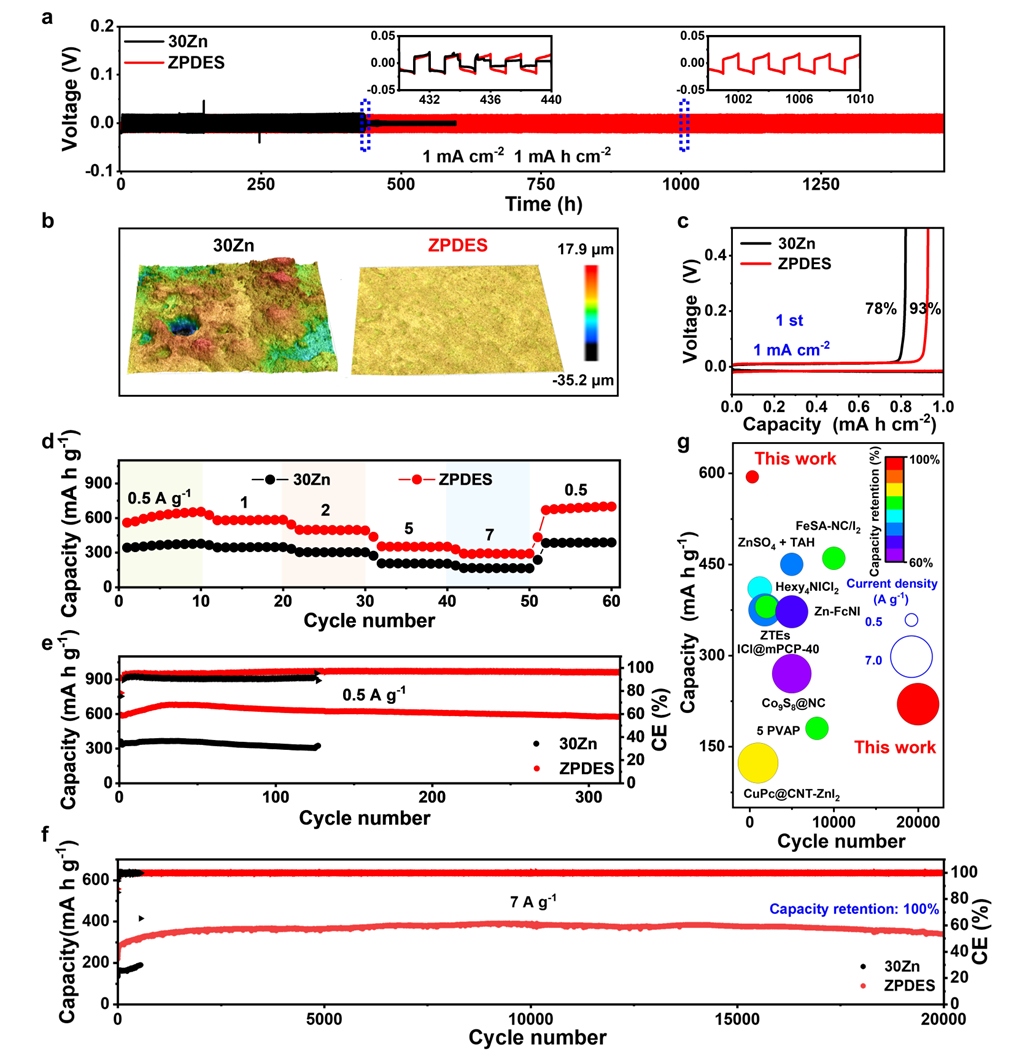 ZPDES体系表现出更低的极化电压和更高的比容量,体现出优异的氧化还原动力学。该体系有效降低了氧化还原能垒并加快了Zn2+的扩散速率,同时显著减小电荷转移电阻,展现出高效的离子传输与电极反应特性(图4)。