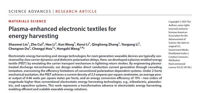 相关研究以“Plasma-enhanced electronic textiles for energyharvesting”为题发表在学术期刊Science Advances(Sci. Adv. 2025, 11,eadx2628., DOI:10.1126/sciadv.adx2628)上。东华大学材料科学与工程学院博士生林绍妹为第一作者,通讯作者为王宏志教授和侯成义研究员。该研究获得了国家自然科学基金委员会、东华大学励志计划等多方面的资助与支持。