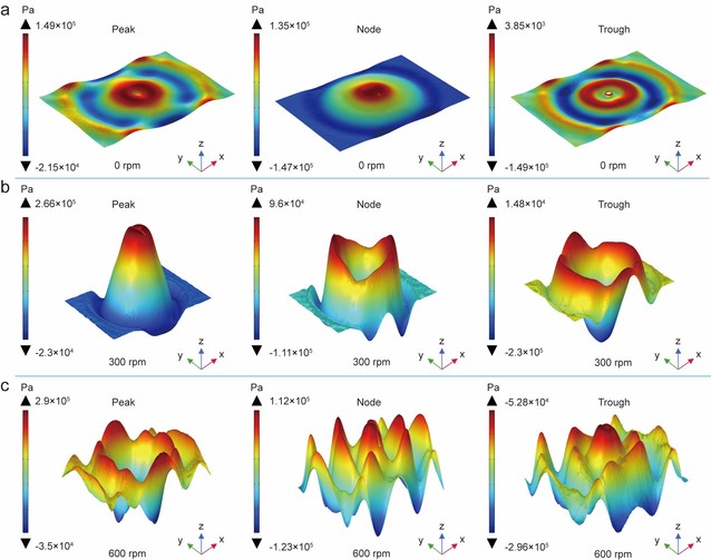图2 利用有限元模拟了同搅拌速度(0 rpm,300 rpm,600 rpm)下,位于驻波的波峰、波节和波谷处的声场分布。在600rpm下不同截面的声波振幅达到最大值,且声场分布更为均匀,从而突出了空化效应的增强并揭示了产率提升的原因。