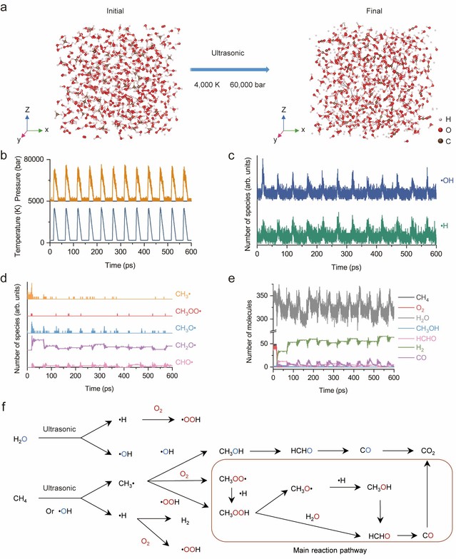 图4 通过分子动力学模拟结合反应机理揭示了环境条件下,无催化剂甲烷部分氧化的反应途径。主要反应途径是通过CH3OOH的形成以及进一步分解反应形成CH3OH,HCHO和CO等C1产物。
