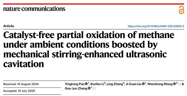 该成果以题为“Catalyst-free partial oxidation of methane under ambient conditions boosted by mechanical stirring-enhanced ultrasonic cavitation”的研究论文,于2025年8月13日在线发表于国际期刊《自然·通讯》(Nature Communications 2025, 16, 7506.)。论文第一作者为东华大学材料科学与工程学院在读博士生潘映佟,共同通讯作者为张国军研究员与王文中研究员。