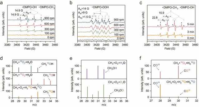 图3 利用EPR检测了反应过程中产生的自由基并依据18O2,D2O, H2O18等同位素追踪确定了生成的C1产物的来源。揭示了氧气的参与对于POM的重要性。