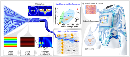 在“可纺”的材料与成形层面,研究团队提出“剪切增强液晶纺丝”新策略:在微流控喷丝区施加可控剪切诱导各向异性液晶相,并在凝固过程中“锁定”分子取向与晶序,从而制备出兼具高取向、高结晶度与高电化学性能的一体化半导体纤维(以BBL为代表)。所得纤维表现出约15.3 GPa的杨氏模量和约600 MPa的抗拉强度,并在极端温度、强紫外和强酸碱/有机溶剂环境下保持稳定;基于该纤维构建的OECT在轴向方向的迁移率与跨导显著优于径向,>10,000次门脉冲循环仍稳定工作。进一步,团队在织物平台上完成了对汗液离子与葡萄糖的逻辑判别,并联合电致变色纤维实现“感知—决策—显示”的可视化健康监测示范,相关成果发表于National Science Review。