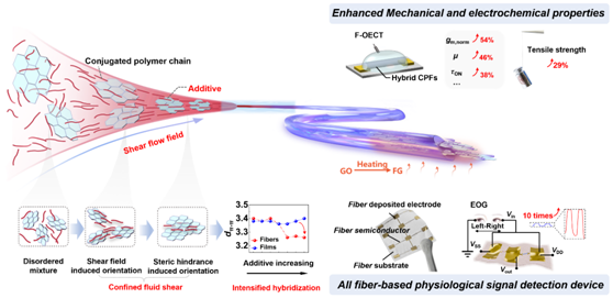 在“可集成”的器件与系统层面,研究团队提出“剪切增强杂化”技术:在湿法纺丝过程中引入功能化石墨烯,实现分子取向与π–π堆积的双重优化,构筑高取向、高共轭的杂化纤维。该策略带来力学强度、模量与本征传输的协同增强,使基于其构建的F-OECT几何归一化跨导提升超过50%、响应更快且稳定性更优。依托n/p型纤维器件的性能匹配,团队进一步构建了全纤维基p–n互补逆变器,实现约90 V/V的眼电(EOG)信号低压放大,完成材料—器件—系统的闭环验证,成果发表于Advanced Functional Materials。