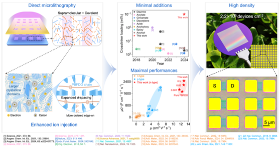 在“可刻”的精密制造层面,团队面向高密度柔性/生物电子的量产需求,提出“超分子协同直接微光刻(DML)”范式:通过痕量(<0.1 wt%)聚轮烷交联剂,在有机离子—电子混合导体(PBFDO)中构建氢键—光致共价的双网络,实现对聚合物微观序构与离子通道的协同调控。在保持优异离子/电子耦合的同时,工艺实现了600 nm级图案分辨率与2.2×105 devices·cm⁻2的晶圆级OECT高密度集成,并显著提升器件迁移率与跨导,成果发表于Advanced Materials。
