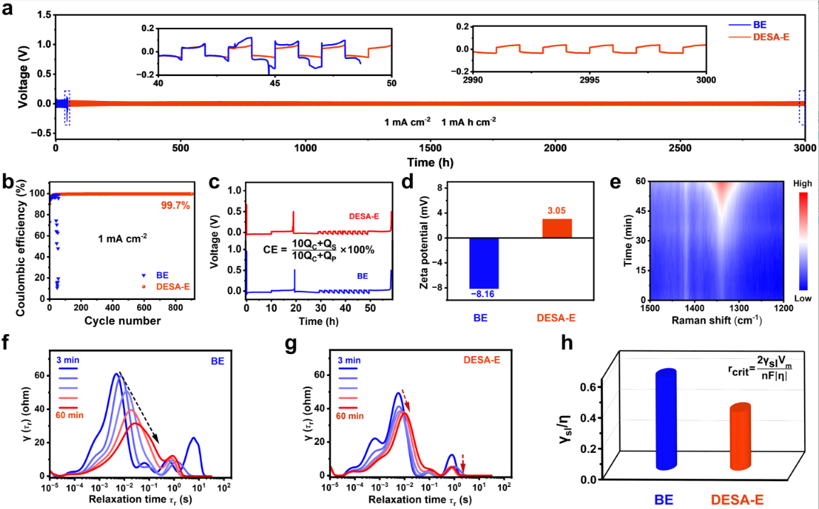 DESA-E 体系显著优化锌沉积/剥离性能,对称电池在1mAcm–2下稳定循环3000小时,不对称电池可运行900 次,远超传统 BE体系。其[PeMIM]+吸附锌表面,降低水分子吸附并形成静电屏蔽,引导Zn2+均匀沉积,实现界面稳定性与动力学协同提升(图4)。