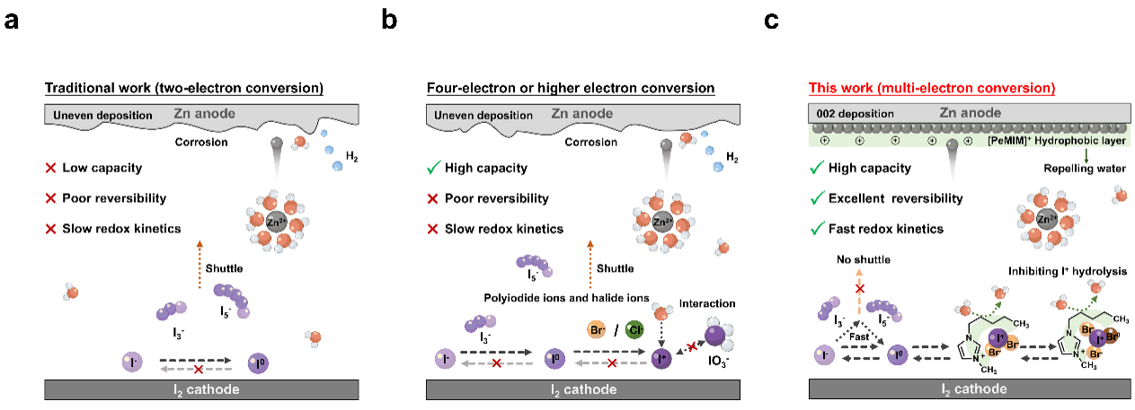 水系锌碘(Zn–I2)电池因其高安全性、资源丰富和成本低廉而被认为是极具潜力的储能体系。得益于碘元素多变的氧化态,该体系有望实现高容量储能。然而,传统Zn–I2电池主要依赖 I–/I0 的两电子转化,导致容量受限、反应动力学缓慢,并伴随明显的穿梭效应。近年来,通过引入卤素离子(如 Cl–、Br–)调控碘价态,可形成卤素间化合物并实现多电子反应,但多电子体系仍受高价碘水解、界面不稳定及可逆性差等问题制约。因此,构建能够稳定高价碘中间体并加速电化学反应动力学的体系,是实现高效可逆多电子Zn–I2电池的关键途径。