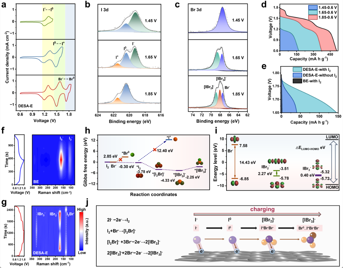 不同电压窗口下依次出现的三对可逆氧化还原峰,揭示了由I–/I0向I0/I+及Br–/Br0的多电子转化过程。双卤素协同作用显著提升Br–/Br0利用率(8.9% → 31.2%),并经XPS、原位拉曼及理论计算得到验证(图2)。