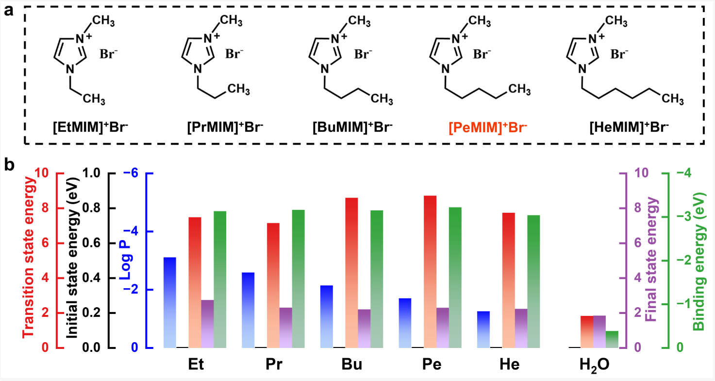 为筛选最优咪唑鎓盐添加剂,研究团队系统比较了不同烷基链长度的 [EtMIM]+Br– 至 [HeMIM]+Br–。理论计算表明,[PeMIM]+Br– 体系具有最高 I⁺ 水解能垒与最强 IBr2– 结合能力,表现出优异稳定性。最终确定0.5M[PeMIM]+Br– 为最优体系(DESA-E)(图1)。
