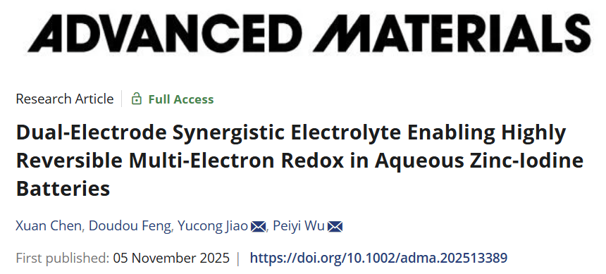 东华大学化学与化工学院博士研究生陈璇为本论文的第一作者,冯豆豆博士生为共同第一作者,通讯作者为焦玉聪研究员和武培怡教授。相关成果近期以“双电极协同电解质实现水系锌碘电池的高可逆多电子氧化还原反应(Dual-Electrode Synergistic Electrolyte Enabling Highly Reversible Multi-Electron Redox in Aqueous Zinc-Iodine batteries)”为题发表在《先进材料》(Adv. Mater.)上。该工作得到了国家自然科学基金、中央高校基本科研业务费专项资金以及上海市自然科学基金的等资助。
