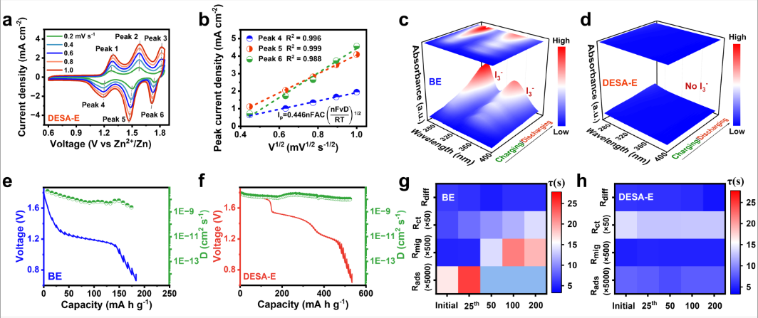 综合电化学与原位光谱结果表明,DESA-E 体系显著提升了碘的氧化还原动力学与多电子反应可逆性,抑制I3–积累并降低界面极化,实现快速稳定的多电子转移过程。(图3)。