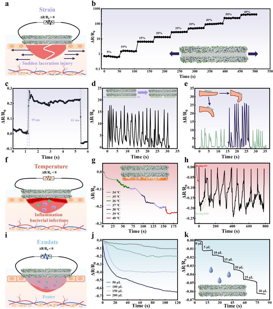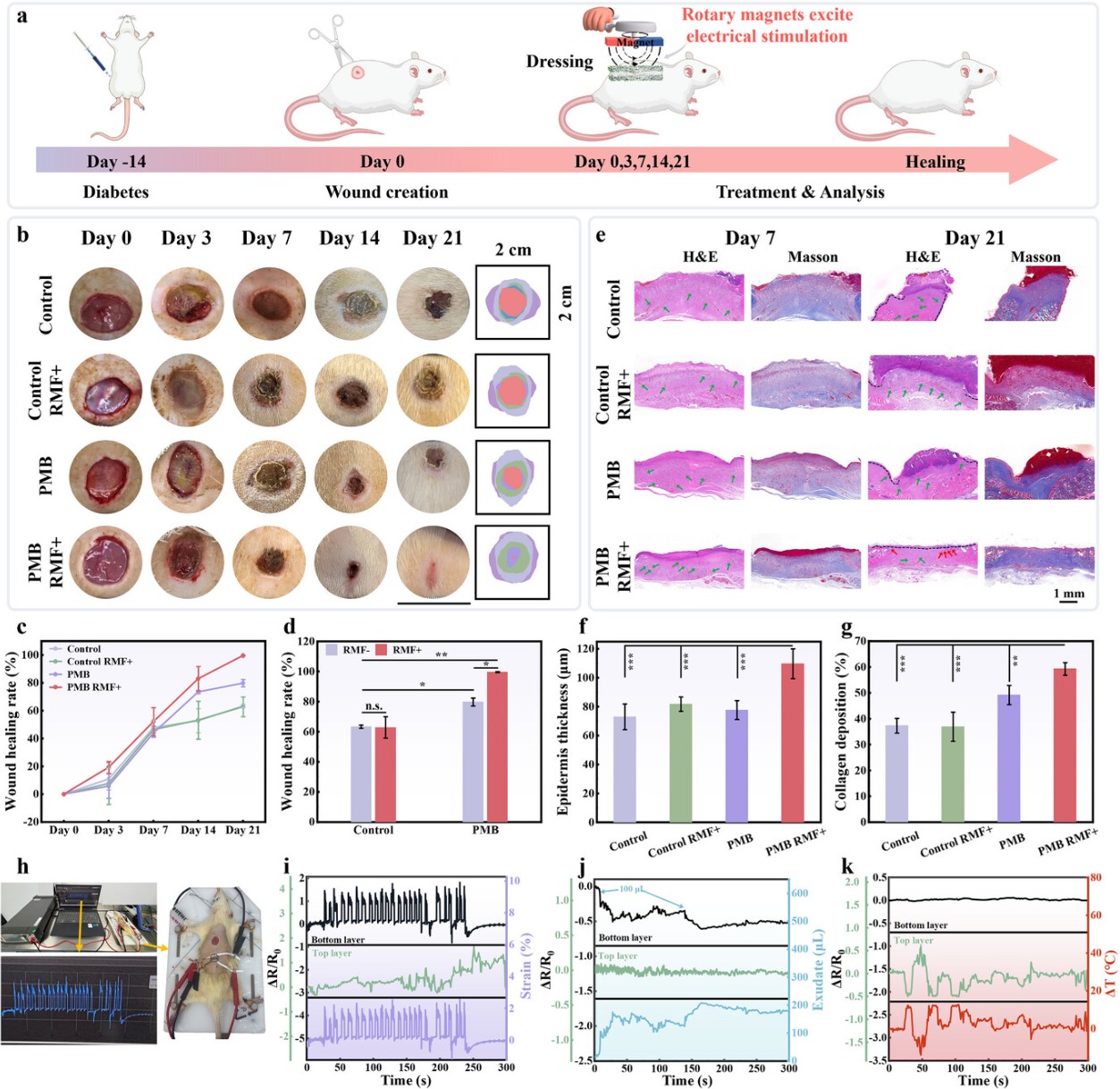 糖尿病患者的伤口因血管病变、神经损伤和慢性炎症形成恶劣微环境,导致愈合和功能重建面临巨大临床挑战。传统电刺激虽能促进细胞增殖迁移、减轻炎症、调节血液循环以加速愈合,但其存在刚性金属电极易引发炎症感染、外部电源设备庞大且需有线连接、操作复杂及成本高等问题,且患者因感觉神经受损难以感知伤口危险状态,增加了创面护理的难度和经济负担。