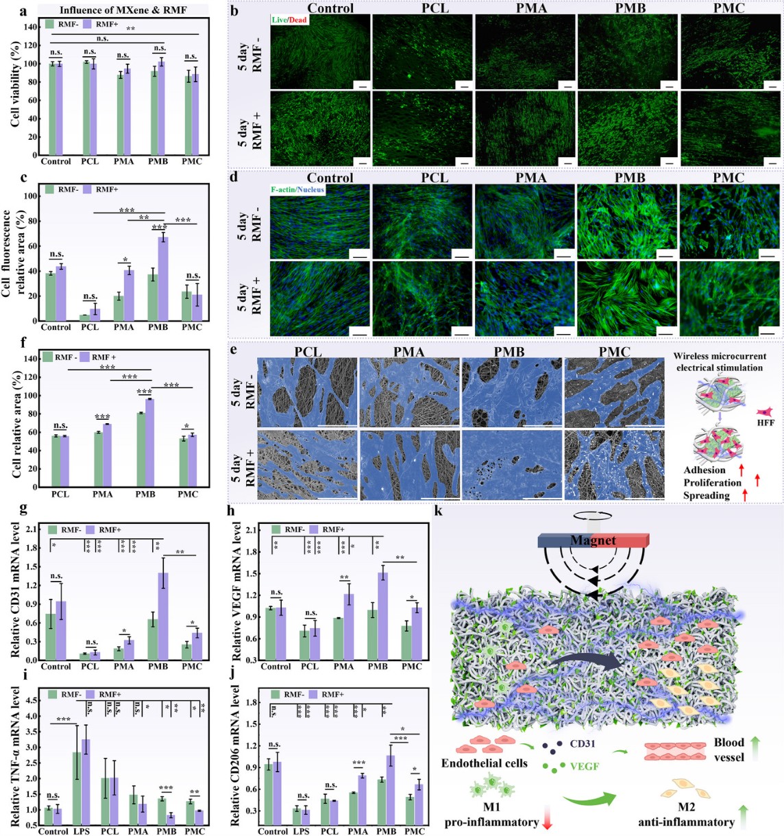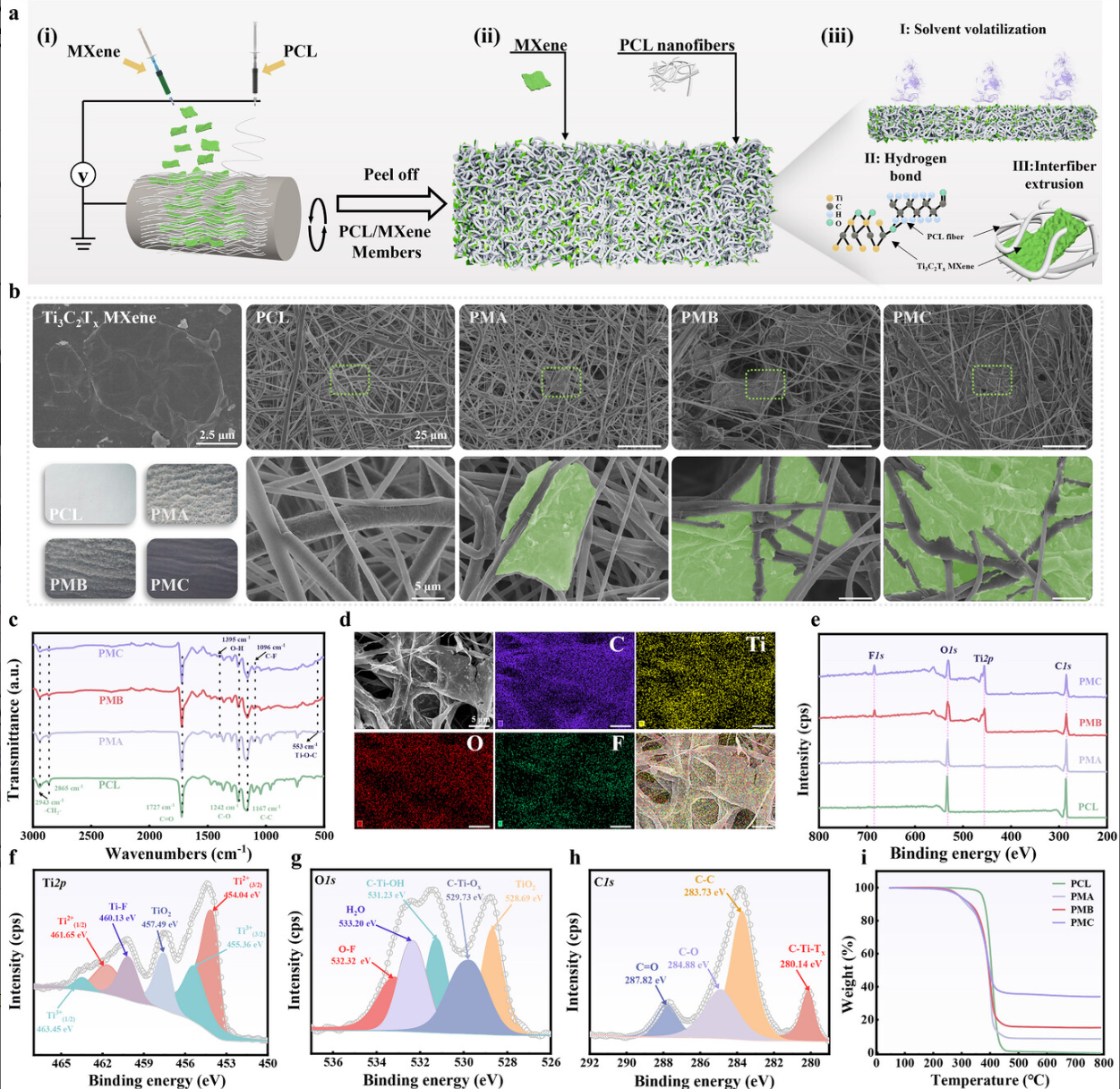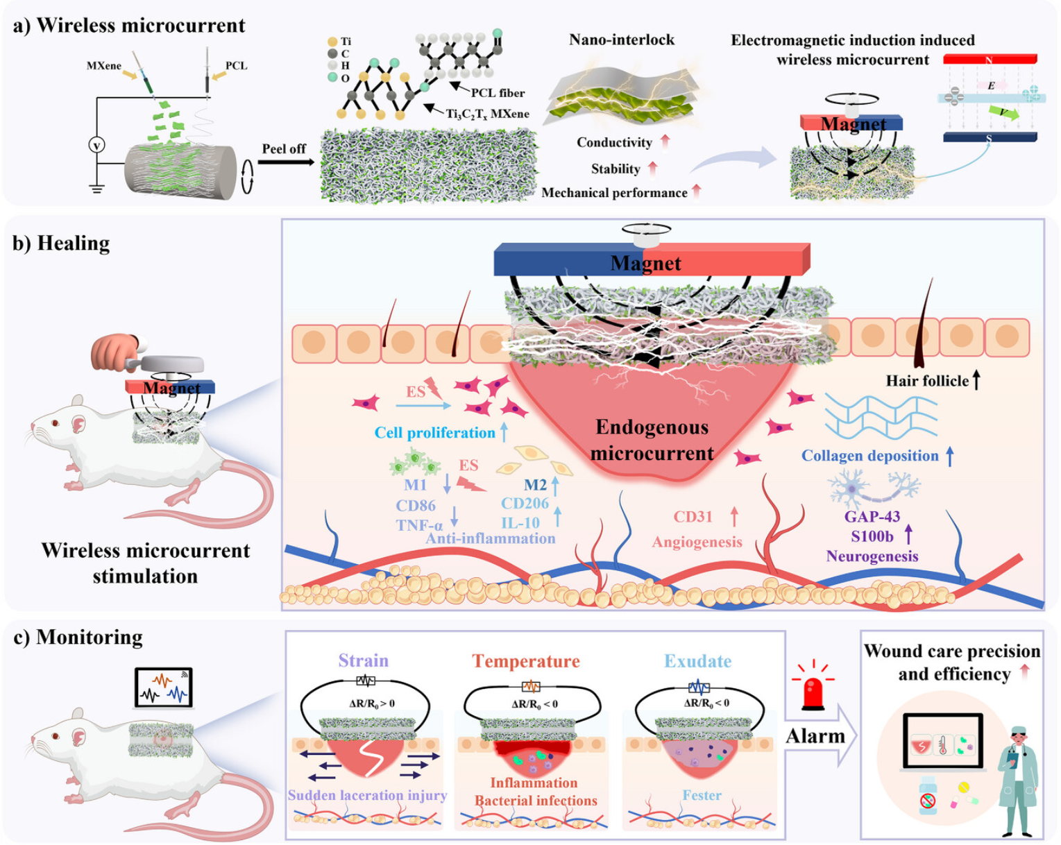 近日,东华大学纺织学院毛吉富研究员、生物与医学工程学院张倩副研究员作为共同通讯在《先进功能材料》(Advanced Functional Materials)上在线发表题为《纳米互锁增强型电活性敷料:基于电磁感应加速糖尿病伤口愈合及微环境监测》(Nano-Interlocking Enhanced Electroactive Dressing: Electromagnetic Induction for Accelerated Diabetic Wound Healing and Wound Microenvironment Monitoring)的研究论文。研究团队开发了一种基于电磁感应供电的电活性敷料,可实现无线电刺激治疗和伤口微环境监测。静电纺丝与静电喷雾技术的集成促使Ti3C2Tx MXene与聚己内酯纤维之间形成的纳米互锁结构,赋予该敷料优异的导电性(电导率≈3.5 Scm-1。在旋转磁场作用下,该敷料可产生10.8 μA的无线微电流,其激活了促愈合通路(钙信号通路、TGF-β、PI3K-AKT、PPAR、轴突导向和Wnt等细胞信号通路),同时抑制炎症通路(TNF和NF-κB细胞信号通路)。这种对细胞行为和免疫微环境的双重调控,与对照组相比,可使创面愈合速度提升约 36.3%,神经再生速度提升约 283.8%。该敷料还能监测创面的生理参数(包括温度、应变和渗出液),实现及时精准的创面护理,推动了电磁感应生物医学和个性化医疗的发展。