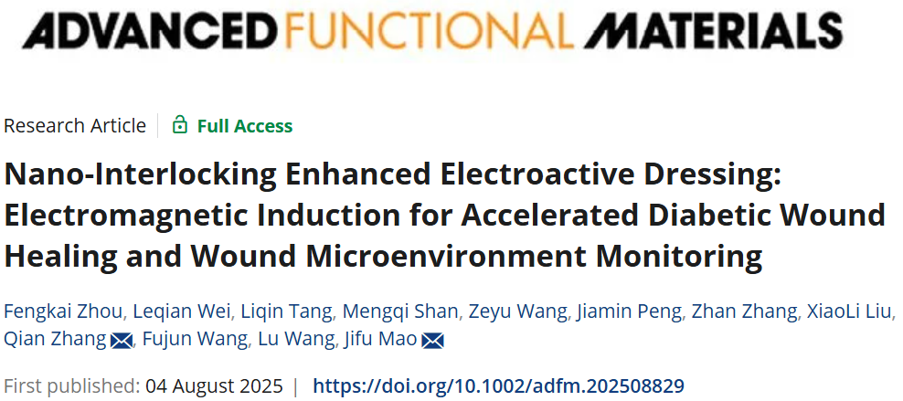 F. Zhou, L. Wei, L. Tang, M. Shan, Z. Wang, J. Peng, Z. Zhang, X. Liu, Q. Zhang, F. Wang, L. Wang, J. Mao, Nano-Interlocking Enhanced Electroactive Dressing: Electromagnetic Induction for Accelerated Diabetic Wound Healing and Wound Microenvironment Monitoring. Adv. Funct. Mater. 2025, e08829.