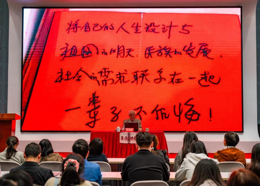 孔海南作“实践洱海生态文明道路的心路历程”主题报告。他讲述了自己放弃海外优渥待遇毅然归国,领衔团队设立国家水污染控制与治理重大专项,数十年攻坚洱海治理,最终显著改善洱海水质,重现海菜花盛景的奋斗历程。他以真实生动的人生故事引导师生将自己的人生设计与祖国的明天、民族的发展、社会的需求联系在一起,把论文写在祖国大地上。