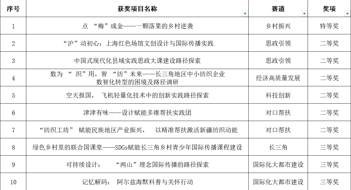 此外,上海国际时尚创意学院“可持续设计:‘两山’理念国际传播的路径探索”项目、外语学院“绿色乡村里的联合国课堂——SDGs赋能长三角乡村青少年国际传播课程建设”项目、生物与医学工程学院“记忆解码:阿尔兹海默症科普与关怀行动”项目获三等奖。