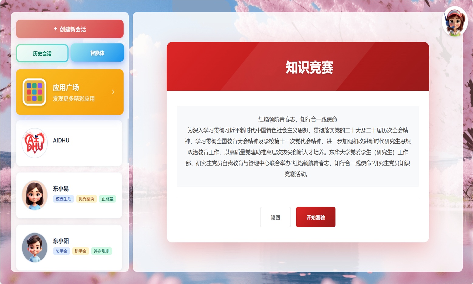 本次知识竞赛为学校研究生党建“红焰领航”计划的品牌活动,同时是学校深入贯彻落实“立报国强国大志向 做挺膺担当奋斗者”宣传教育的重要举措。活动创新“数字思政”育人模式,引入“AI·DHU”AI辅导员系统、“东小焰”“东小航”数字人形象等, 以知识竞赛为载体,引导广大研究生党员以赛促学、以学促行,在夯实理论根基中展现服务强国建设的青春作为与时代担当。