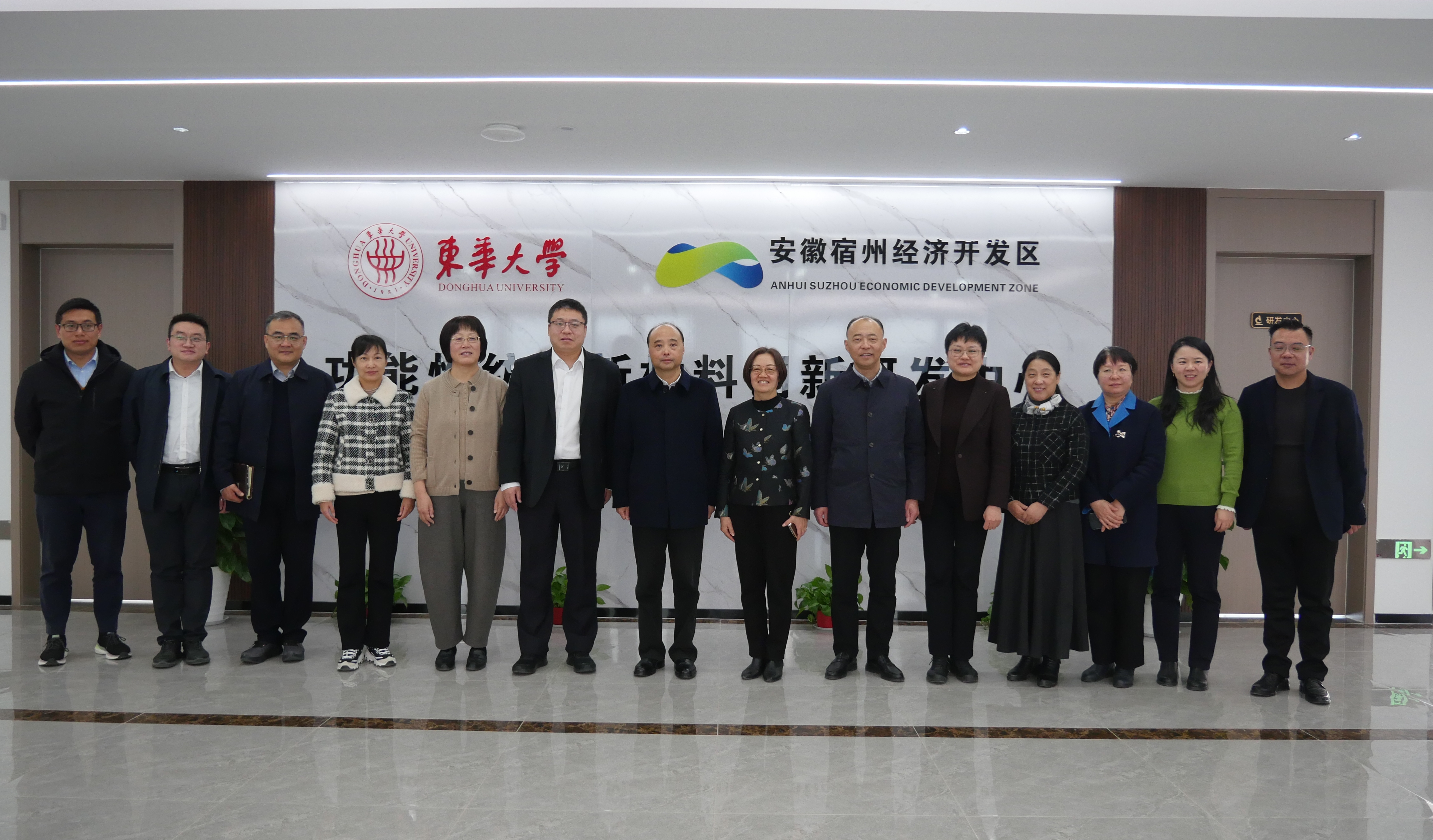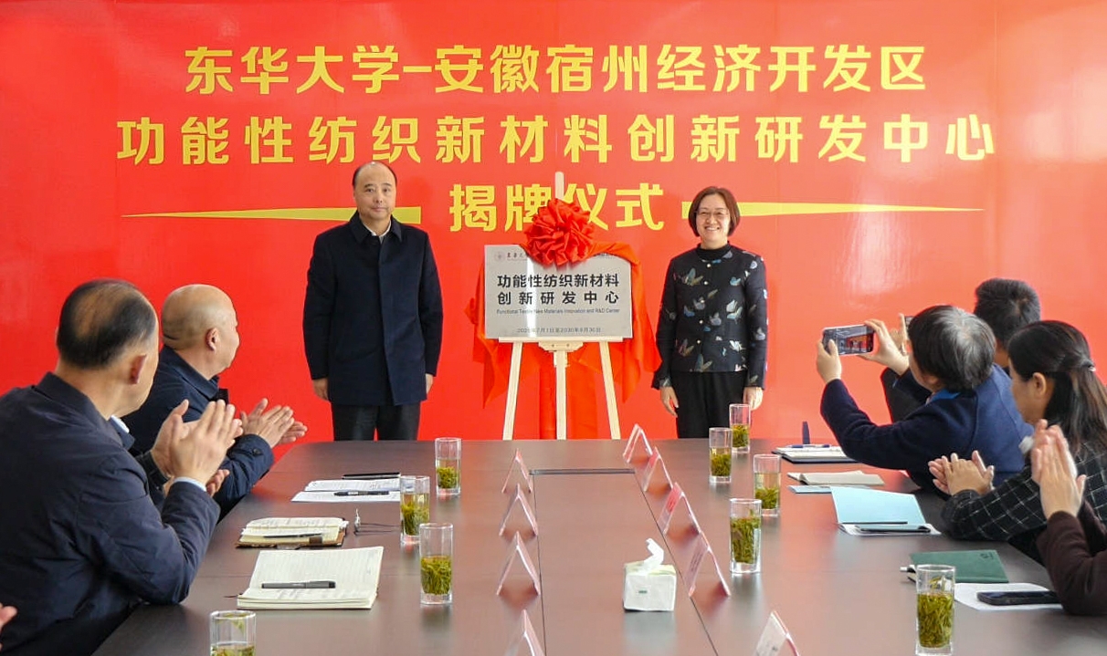 为全面深化校地战略合作,推动产学研协同创新与科技成果高效转化,12月3日,我校与安徽省宿州市经济开发区共建的“功能性纺织新材料创新研发中心”在安徽鑫圣佳无纺科技有限公司正式揭牌成立。揭牌仪式以“协同创新·共启未来”为主题,东华大学党委常委、副校长刘淑慧出席,科研院、纺织学院相关负责人及师生代表参加仪式。宿州市委常委、副市长祖钧公出席并致辞,揭牌仪式由宿州市经开区党工委委员、管委会副主任陈少兴主持。
