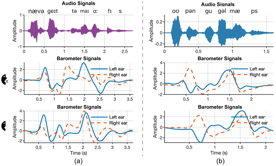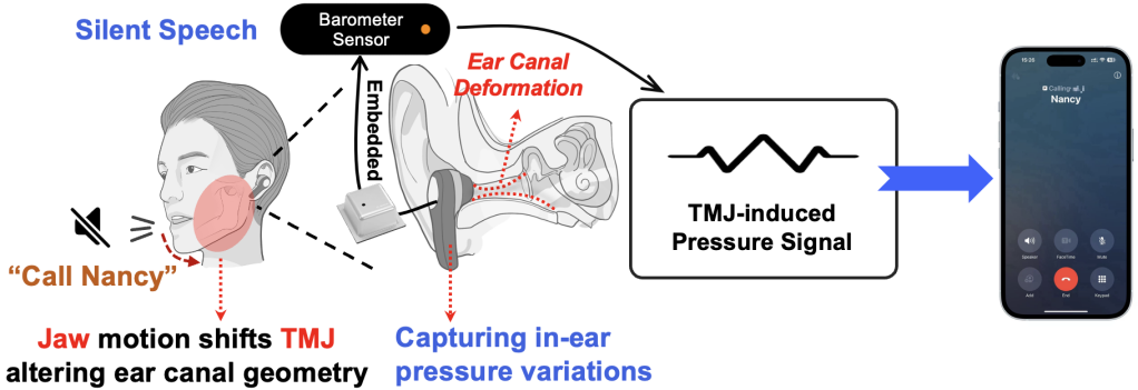 但现有的基于视觉、无线信号或惯性传感器的无声语音接口方案常面临侵入性强、环境敏感或部署复杂等问题。本研究提出一种名为Baro2Talk的新型耳戴式无声语音交互系统,如图1所示,Baro2Talk设计的核心见解是:即使在无声状态下进行的言语发音,也会引起耳道压力的微妙波动。这些压力变化主要由以颞下颌关节(TMJ)为主的(连同下颌、舌头及其他周围口腔结构)发音运动驱动,展现出一致且包含语义信息的模式(如图2所示)。本研究将这些序列称为颞下颌关节主导的压力变化序列(TPVS)。这为建立耳内压力变化与其根本原因(TMJ运动)以及最终语义之间的映射模型提供了契机。