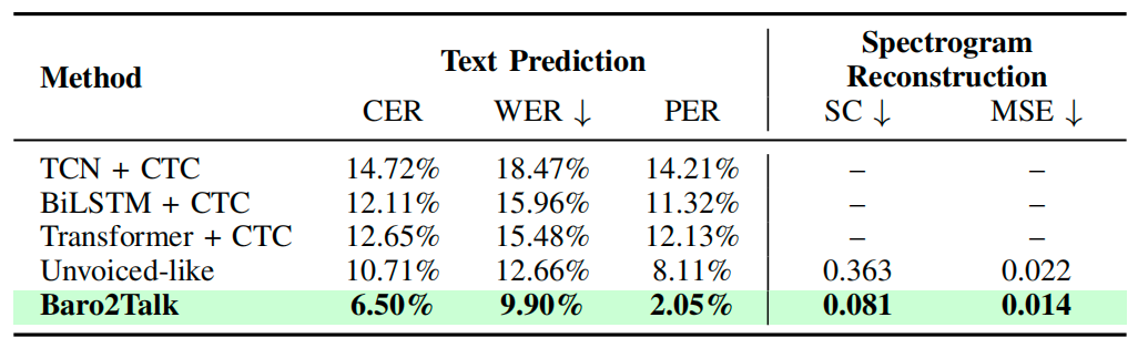 本研究跨越六个月,收集来自25名参与者(包含无声和有声发音条件)的数据集对该系统进行了评估。如表1所示,该系统在文本预测和梅尔语谱图重建方面均由于代表性的SSI基准方案。