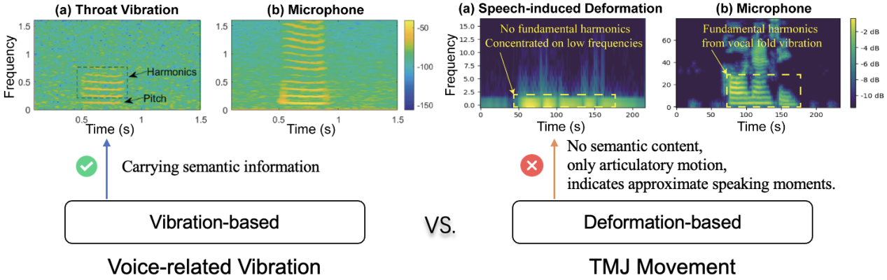 为此,本研究将微型气压计嵌入标准耳塞中以捕获TPVS,并利用其重建梅尔语谱图,而非直接还原文本内容。这是因为压力信号的采样率(约100 Hz)远低于音频信号,导致低频TPVS与高维文本嵌入之间存在显著的维度失配。直接将TPVS映射到文本将需要海量的数据。相比之下,梅尔语谱图将TPVS转化为符合语音特征的高频表示,在桥接模态差异的同时保留了共振峰和基频轮廓等关键特征。此外,由于梅尔语谱图是通用自然语音识别系统(如Whisper)的标准输入,所以成为了理想的中间表示。然而,本研究仍然面临三个关键挑战:1.低信噪比与易受干扰的压力信号。本研究提出一套数据预处理流程,包括直流漂移去除、带通滤波和信号放大,以降低噪声并清晰化形变信号。并通过局部稳定性检查增强的短时能量检测方法,从连续的TPVS中提取无声语音形变事件;2.用户间差异与节奏多样性。如图3所示,本研究使用领域对抗学习训练了一个Baro-Encoder,以提取用户不变的语义特征。同时,设计了一种基于节奏感知的数据增强策略,生成TPVS的时域扭曲变体,增强对说话速度变化的鲁棒性;3.非声学模态与缺乏细粒度监督。如图4所示,与基于声带或扬声器振动的语音信号不同,TPVS源于人类内部发音动作,不含声能。其频谱图在语音领域并非固有有意义,使得直接映射到音频频谱图变得不可行。此外,无声语音缺乏对齐的音素或帧级标签,阻碍了传统监督回归或基于对齐模型的使用。