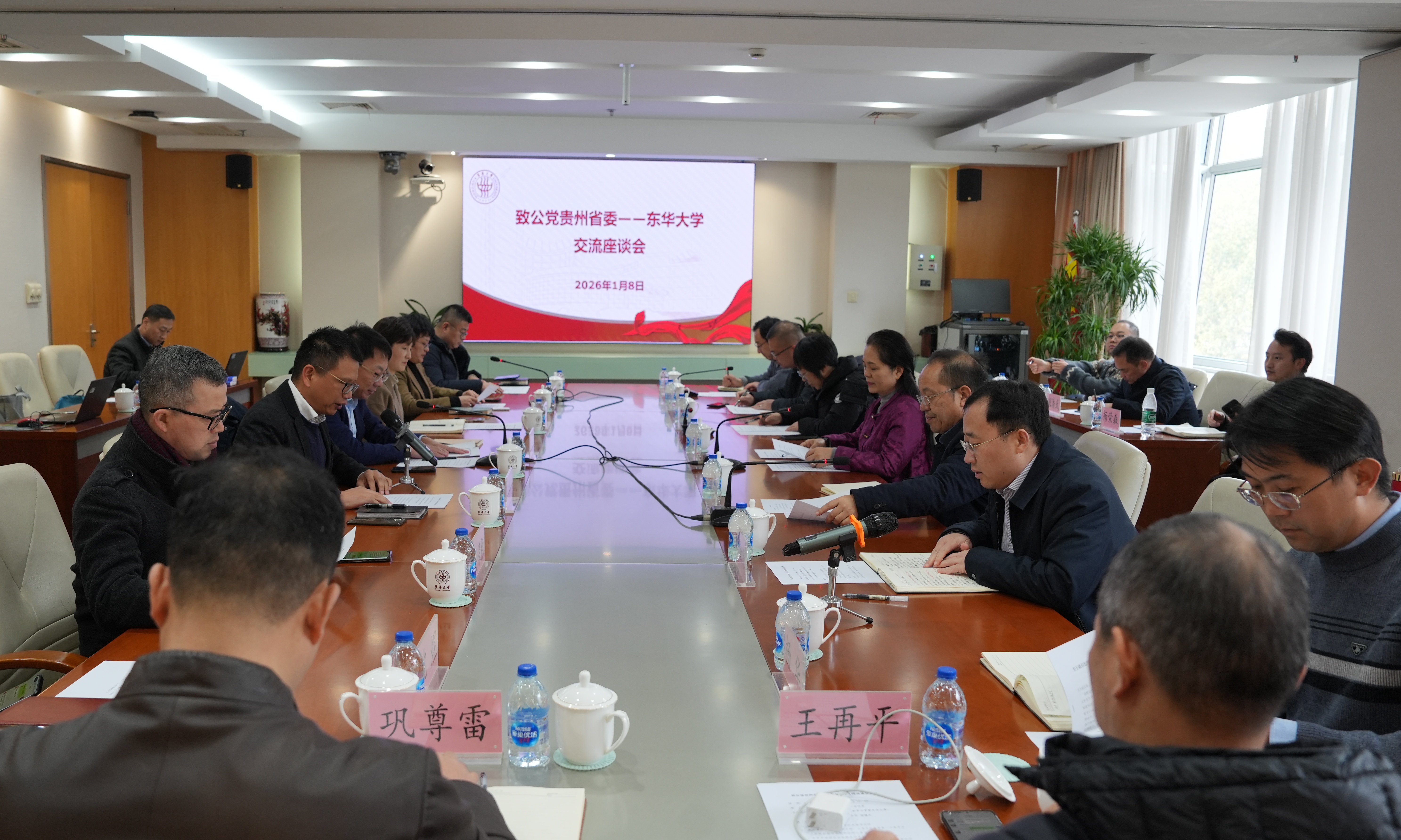 1月8日,致公党中央联合致公党贵州省委、上海市委一行来校交流座谈。本次会商围绕落实统一战线“地域+领域”组团式帮扶部署,聚焦支持贵州省毕节市乡村全面振兴与高质量发展,旨在进一步深化跨区域民主党派协作机制。校党委副书记李成龙出席,学校党委统战部、科学技术研究院产学研合作处、校地合作办公室、上海国际时尚科创中心相关负责人及致公党东华大学委员会代表参会。会议由致公党东华大学委员会主委、校分析测试中心主任杨曙光主持。