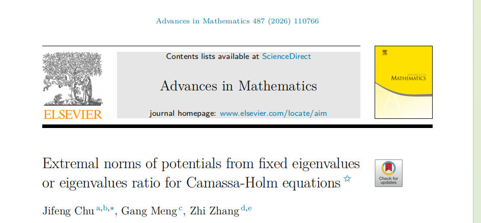 近日,我校数学与统计学院青年教师张智与其合作者在国际数学重要期刊《美国数学进展》(Advances in Mathematics)发表了题为《具有固定特征值或特征值比值的 Camassa-Holm 方程势能函数的极值范数》(Extremal norms of potentials from fixed eigenvalues or eigenvalues ratio for Camassa-Holm equations)的学术论文。该期刊创刊于1961年,致力于发表纯数学各领域具有突破性的重要成果,是中国数学会优秀期刊目录T1期刊,是国际数学界公认的权威数学期刊之一,具有很高的学术声誉。