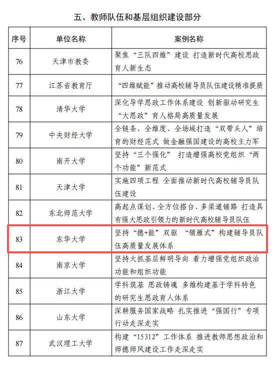 3月25日,教育部首批新时代学校思想政治教育典型案例征集结果正式公布,我校案例《坚持“德+能”双驱,“领雁式”构建辅导员队伍高质量发展体系》入选。