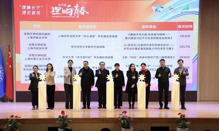 活动现场,我校与上海市第三女子中学共同点亮灯柱,启动长宁“理‘响’青春”系列宣讲活动,《给“00后”讲讲中国共产党人精神谱系》入选长宁区结对宣讲项目。结对共建后,双方将构建常态化合作机制,为开展宣讲育人实践、锻造理论宣讲队伍注入强劲动能。现场外特别设置了“习语金句·青春共鸣”和“高校宣讲团风采”两大主题展板展示区,我校“学习进行时”学生理论宣讲团受邀展示团队简介、品牌亮点、金牌课程及优秀讲师风采。