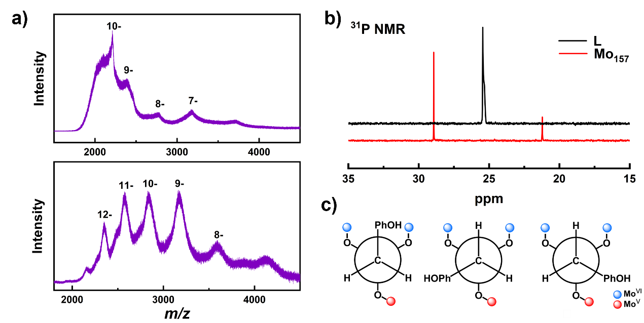 图2.(a){Mo118}和{Mo157}在CH3CN溶液中的ESI-MS光谱;(b) {Mo157}与羟基苄基膦酸在D2O中的31P NMR以及(c)苯基膦酸配体三种构象异构体的示意图。