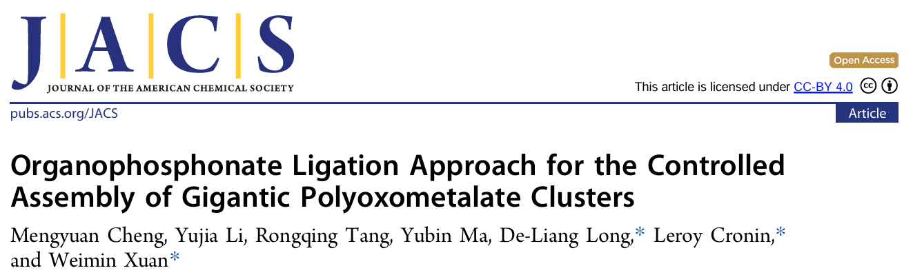 近日,化学与化工学院宣为民特聘研究员课题组在高核多金属氧簇(Polyoxometalates)的可控组装领域取得重要突破。相关研究成果以《有机膦酸配位策略用于巨型多金属氧簇的可控组装》(Organophosphonate Ligation Approach for the Controlled Assembly of Gigantic Polyoxometalate Clusters)为题,发表在国际化学领域顶级期刊《美国化学会志》(Journal of the American Chemical Society, JACS)上。