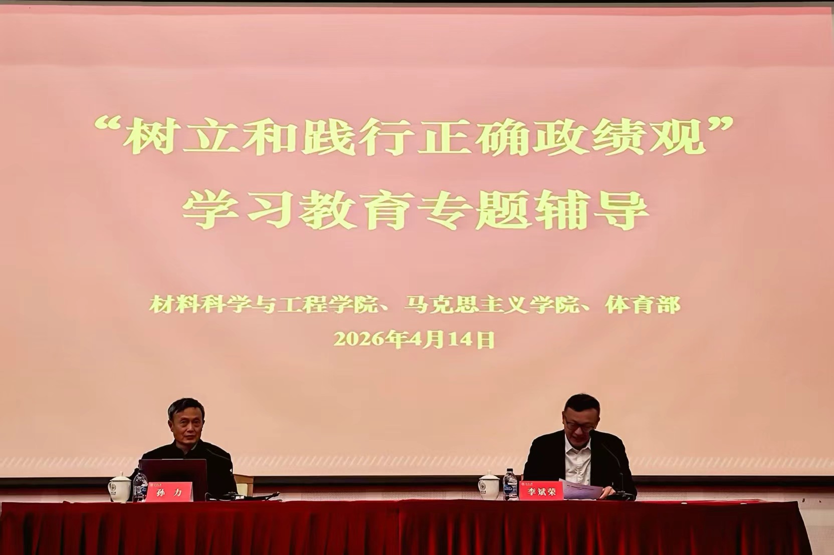 近日,材料科学与工程学院党委、马克思主义学院党委和体育部党总支联合举办树立和践行正确政绩观学习教育专题辅导报告会。相关院部党政领导班子成员、师生党员代表500余人参会。材料科学与工程学院党委书记李斌荣主持会议。