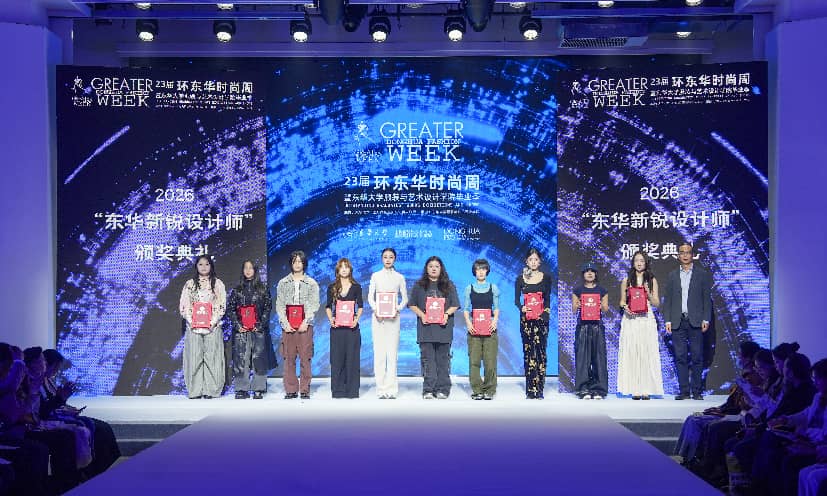 2026“东华新锐设计师”作品亮相开幕式。阎林平为10位获奖新锐设计师颁奖。60套作品借先锋廓形引人入胜,以解构设计打破常规,用智能表达直抵人心,诠释“不困于陈规,不惑于惯性”的设计哲学,深度诠释新时代青年对时尚、文化、社会与未来的思考。